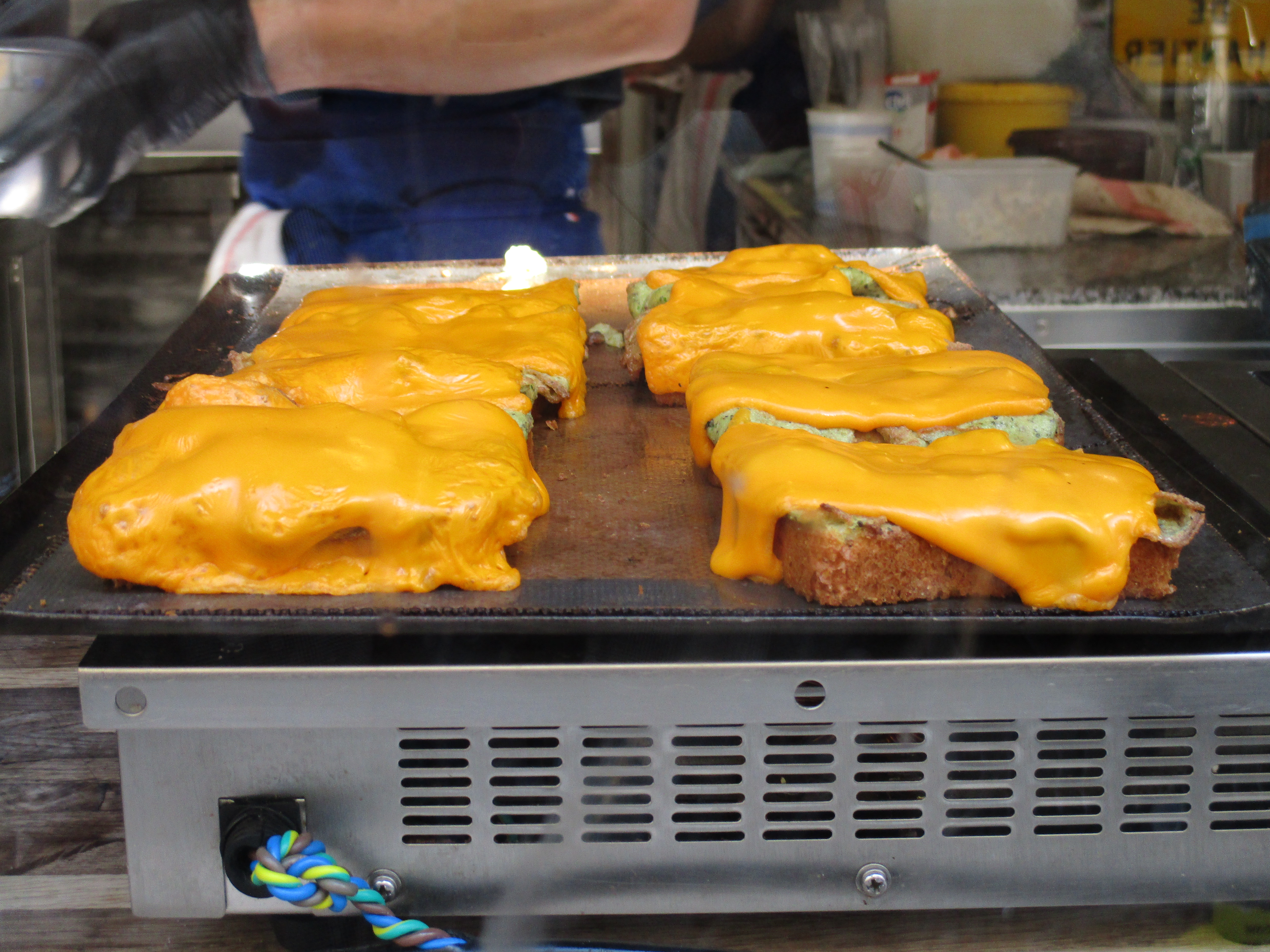 Nourritures terrestres (de deux établissements différents). A droite, çà ressemble à du welsh rarebit (revisité avec du curcuma ?)…