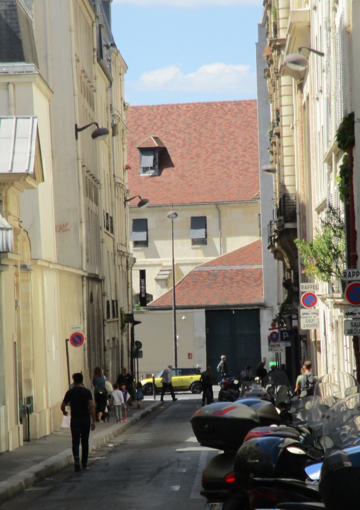 En donnant vers la rue de Sèvres, curieusement la rue de l’Abbé-Grégoire se rétrécit et permet d’entrevoir les toits en tuiles des anciens bâtiments de l’hôpital Laënnec.
