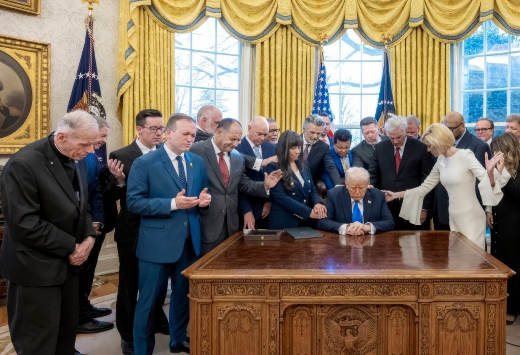 La photo en bannière de titre de cet article fait froid dans le dos. Ce rituel ne se déroule pas dans une théocratie à Téhéran ou à Lhassa, mais dans le bureau ovale de la Maison Blanche : Trump, mains jointes, yeux fermés, entourés de pasteurs. Le comble, c’est qu’il ne s’agit même pas d’une prière, mais d’un rituel d’« imposition des mains », consistant à « poser, étendre les mains sur quelqu’un pour le bénir, le guérir ou lui conférer un pouvoir » ! Organisé par la pasteure Paula White (sur la photo habillée en… blanc), cheffe du Bureau de la Foi (sic) au sein de la maison Blanche, ce rituel rassemblait des personnalités évangéliques responsables d’églises implantées un peu partout.